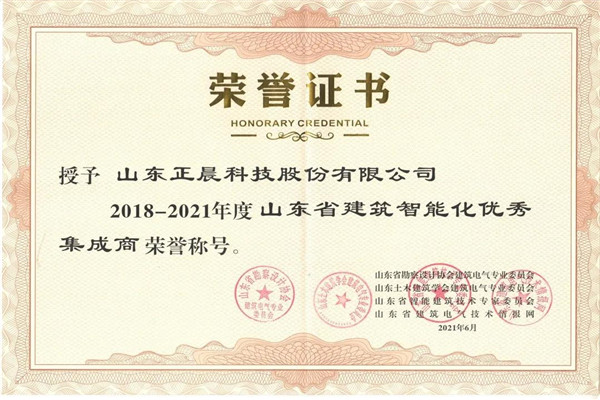 2021年6月20日~6月23日,山东省建筑电气与智能化2021年年会在日照天德国际大酒店隆重举行。正晨股份凭借过硬的工程质量、丰富的项目实施经验,荣获“2018-2021年度山东省建筑智能化优秀集成商”荣誉称号。